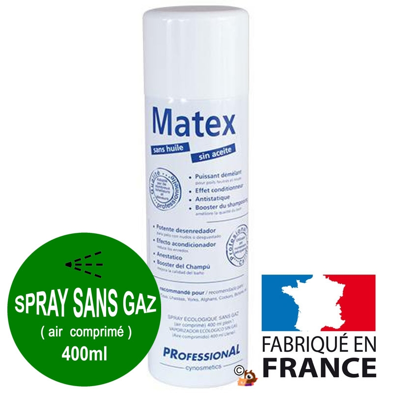 Matex démêlant chien à poils longs et épais permet d'enlever les bourres feutrées et nouées des chiens et chats l Matex est un protecteur non gras. Ce démêlant utilisé chez les toiletteurs est aussi un conditionneur nourrissant qui retarde la formation des noeuds. Ce spray est fabriqué en France. Lot : 277A54