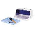 Mini stérilisateur de toiletteur pour accessoires ciseaux, têtes de coupe, etc. avec lampe UV germicide. 5 watts. Il est doté d'un interrupteur et d'une porte bleue coulissante filtrant les UV, même lorsque la porte reste ouverte.