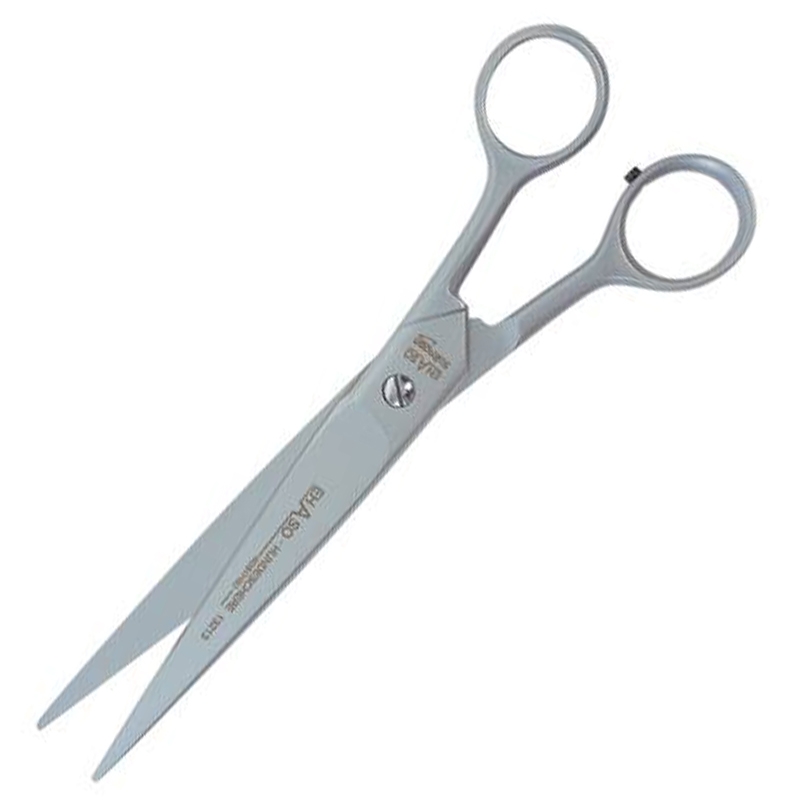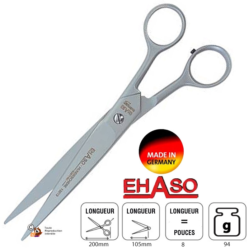 Une paire de ciseaux droit lame large de 20 cm microdentée en acier inoxydable avec un poids de 94 g Spécialement affuté en creux pour une manipulation plus facile et plus sople. Les ciseaux EHASO sont fabriqués à la main à Solingen (Allemagne) depuis plus de 60 ans. Les ciseaux EHASO sont de haute qualité et le fil de leur lame est particulièrement tranchant, lame microdentée. Ces ciseaux ne sont pas produits industriellementmais sont fabriqués à la main par des artisans.