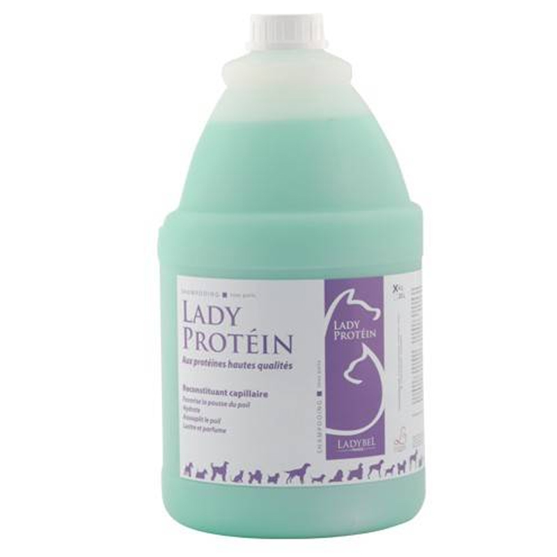 Ladybel shampoing protéines bio de riz spécialement étudié pour tous les types de poils, désodorise, nourrit le poil et la peau, favorise la repousse du poil, lui donne du brillant et protège sa couleur. C'est le shampoing universel haut de gamme. A utiliser pur ou dilué, 1 volume d'après-shampoing et jusqu'à 9 volumes d'eau chaude soit 2 litres. L'ensemble de notre gamme shampoing Ladybel est disponible ICI