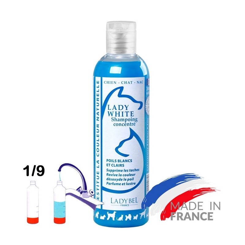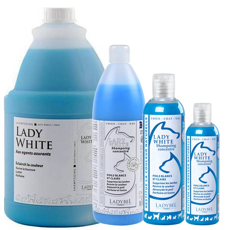 Entretien pour chien poil blanc Ladybel Lady White shampoing aux extraits de camomille biologique, spécial poils blancs / clairs. Il restitue les couleurs, évite le jaunissement, redonne une clarté spectaculaire aux fourrures et lustre la fourrure. Pour toutes races de chiens, chats et NAC (nouveaux animaux de compagnie). Eviter le contact avec les yeux. A utiliser pur ou dilué, 1 volume d'après-shampoing et jusqu'à 9 volumes d'eau chaude soit 2 litres. L'ensemble de notre gamme shampoing Ladybel est disponible ICI