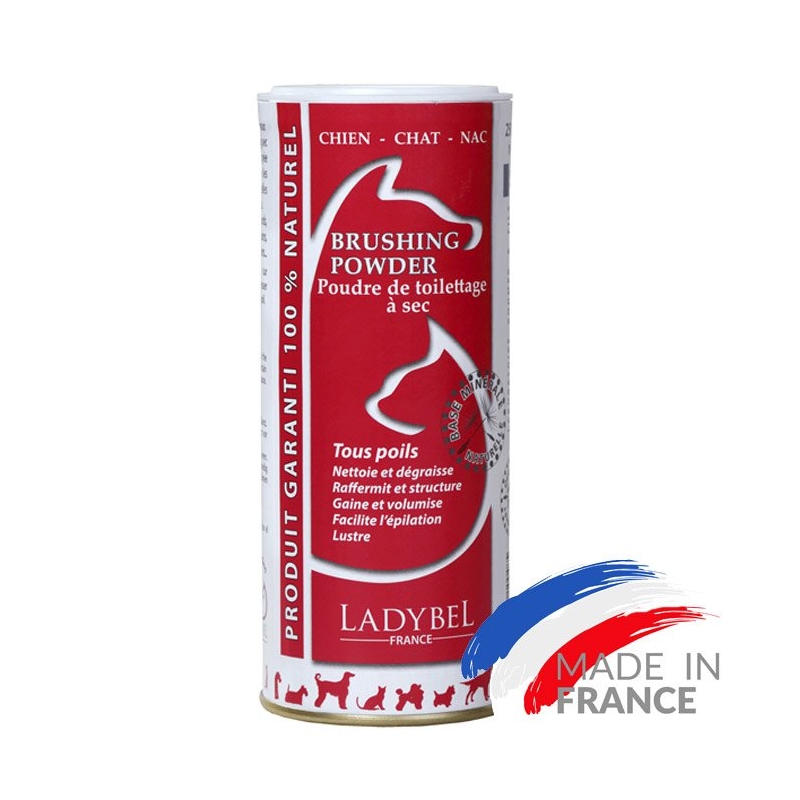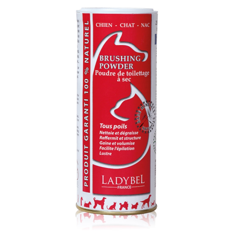 Shampoing sec pour chien Brushing Power Ladybel une poudre minérale ultra fine permettra de retirer les salissures grasses, les traces de boue, de terre et éliminer le sébum superflu sur le chien et chat. Boite de 250g L'ensemble de notre gamme shampoing Ladybel est disponible ICI