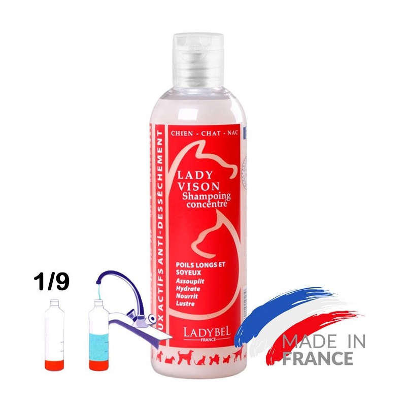 Ladybel - Shampoing a l'huile de vison spécialement étudié pour les chiens à fourrures longues et très fines : Yorkshire, Afghans, Bichons Maltais, Caniches, Lhassa Apso, Shih Tsu, Setters, Cockers,....II est excellent contre le dessèchement du poil et de la peau, désodorise, favorise la pousse du poil, lui donne brillant et moelleux et protège sa couleur. Le shampoing des champions ! Au délicat parfum frais. A utiliser pur ou dilué, 1 volume d'après-shampoing et jusqu'à 9 volumes d'eau chaude soit 2 litres. L'ensemble de notre gamme shampoing Ladybel est disponible ICI