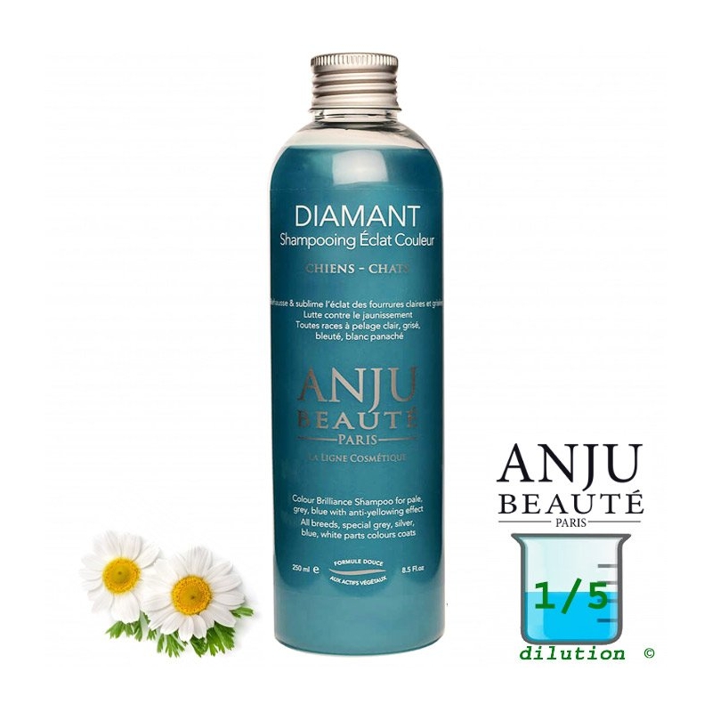 shampooing Diamant il rehausse et sublime l'éclat des fourrures claires et grisées. Lutte le jaunissement pour à pelage clair, grisé, bleuté, blanc panaché au pH peau chien neutre