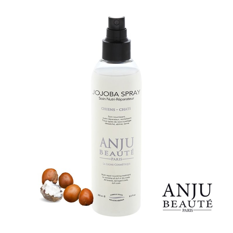 Spray pour chien Anju Jojoba lutte contre la décoloration, grâce à un filtre anti-UV + vitamine BE, B6, E nourrissant, réparateur, revitalisant pour pelage terne et desséché à l’huile non grasse qui participe à la repousse des poils.