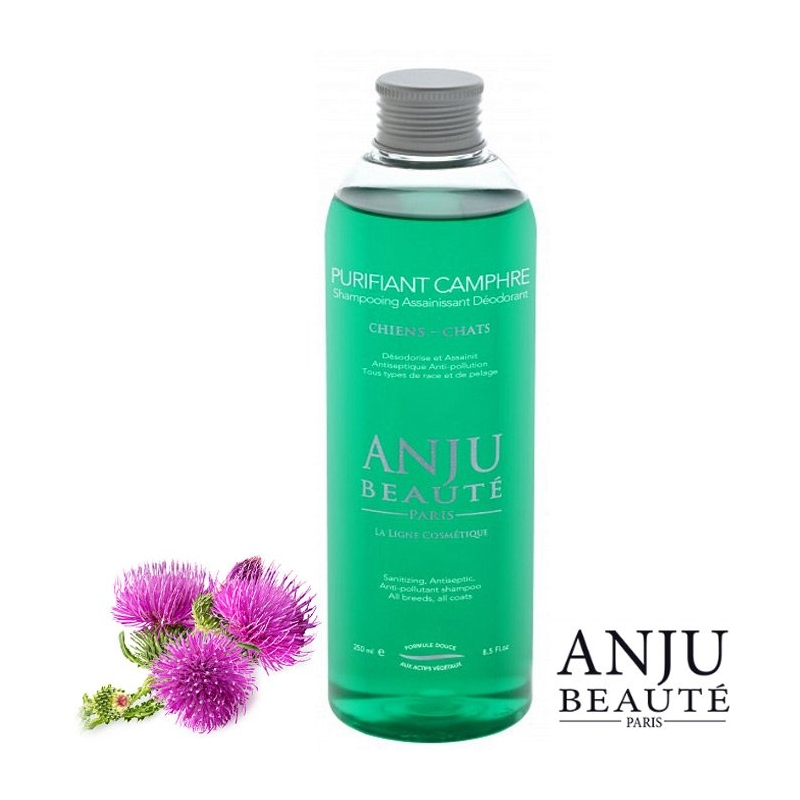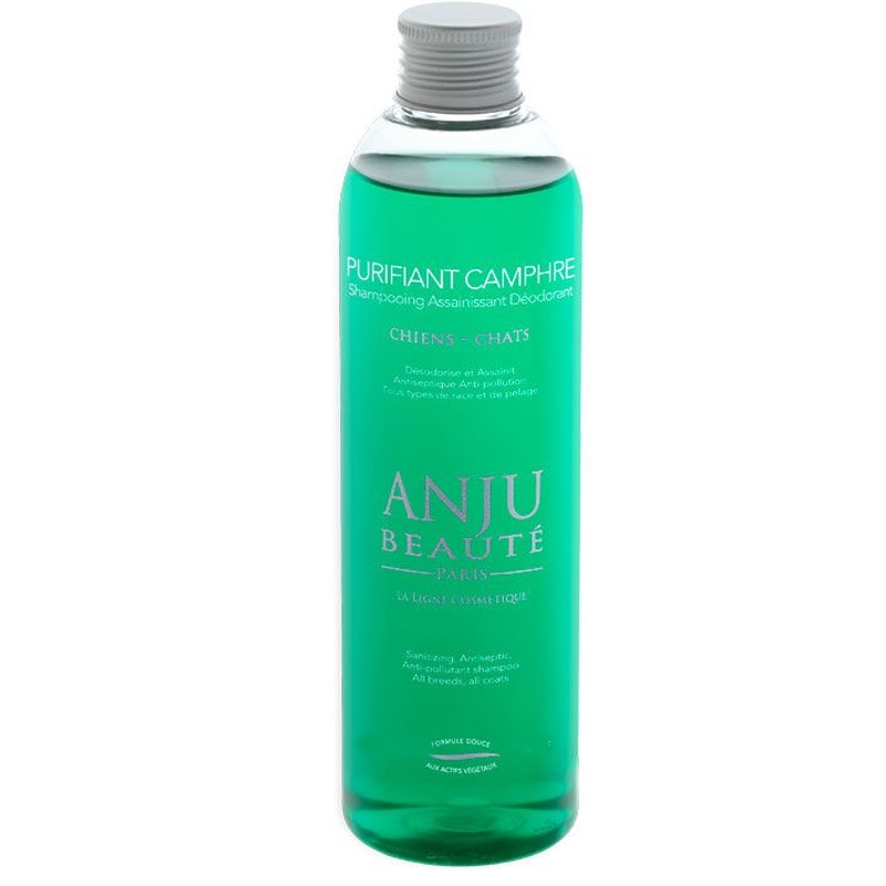 Shampoing chien anti odeur Anju Purifiant Camphre aux propriétés désodorisantes, antiseptiques et assainissantes, à base d'ingrédients naturels pour tous types de race et pelage.