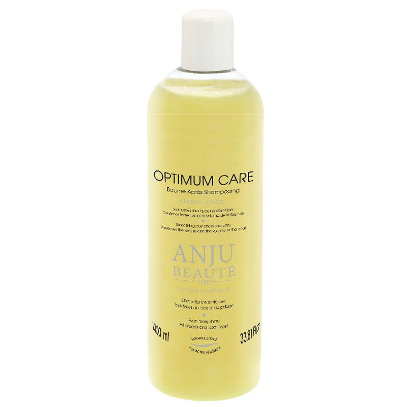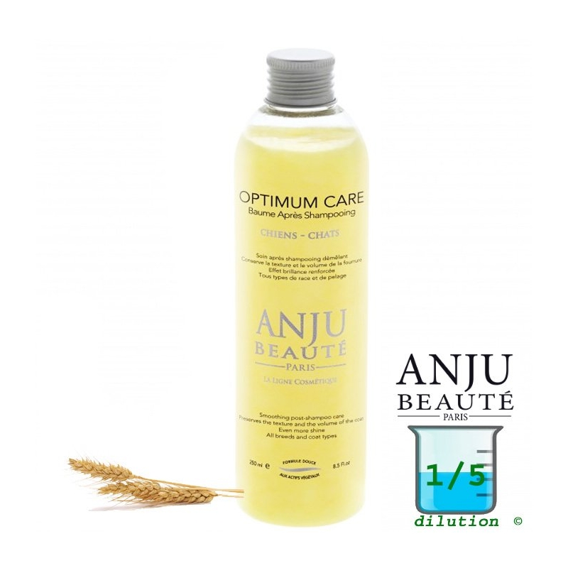Après shampoing chien Optimum Care Anju : un démêlant qui conserve la texture, donne du volume à la fourrure avec un effet brillance renforcé : convient pour types de race et de pelage.