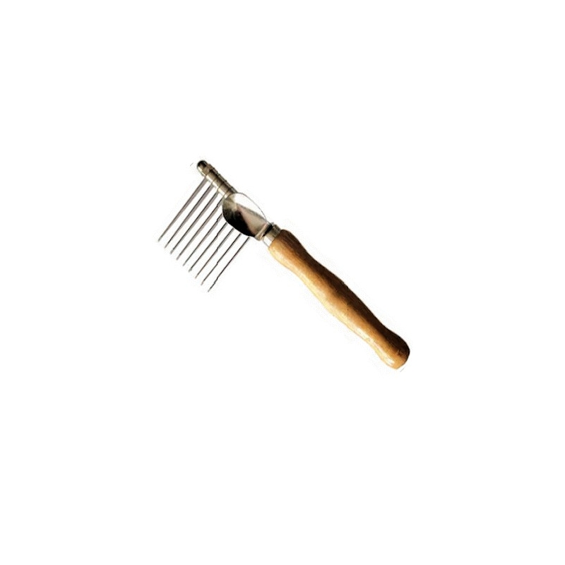 Demeloire chien manche en bois permet le démêlage aux fourrures très emmêlées est muni de lames coupantes permettant de couper avec l'aide des dents aiguisées de ne pas arracher le poil des petits noeuds au gros noeuds bourre doivent être coupés à l'aide de ciseaux dans le sens de la longueur. Excellent rapport qualité prix pour cette gamme d'outils et solides.