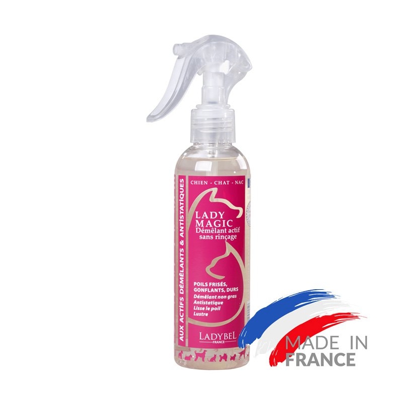 LADY MAGIC Dry de-matting 200ml Non gras, ses principes actifs procurent une grande efficacité au démêlage et au brushing sans rinsage , lisse le poil et lustre aux protéines de riz biologique. L'ensemble de notre gamme shampoing Ladybel est disponible ICI