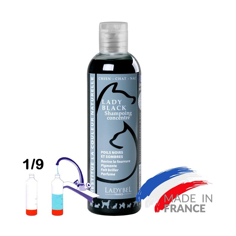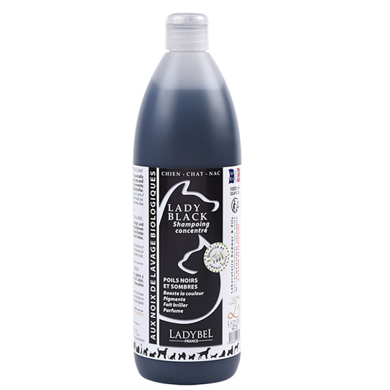 Ladybel shampoing aux extraits de noix : biologique spécialement étudié pour les poils noirs ou sombres des chiens, chats et NAC. Par sa pigmentation, il restitue la couleur, évite le ternissement, redonne un noir profond à la fourrure et lustre le poil. Pour toutes races de chiens, chats et Nouveaux Animaux de Compagnie. A utiliser pur ou dilué, 1 volume d'après-shampoing et jusqu'à 9 volumes d'eau chaude soit 2 litres. L'ensemble de notre gamme shampoing Ladybel est disponible ICI