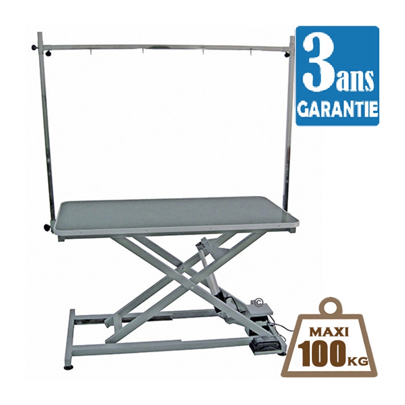 ❤️Table de toilettage chien électrique à pantographe STAR, plateau bois 120x60cm recouverte d’un tapis antidérapant facile à nettoyer, variation de la hauteur de 40 à 100 cm, livrée avec potence double inox réglable et 1sangle. Poids maximum 100 kg. Avantage importateur & SAV est en France A l'attention des utilisateurs : une fois attaché à la potence le chien ne doit pas rester sur la table sans surveillance d'autres tables disponibles pour particulier ou professionnel du toilettage.