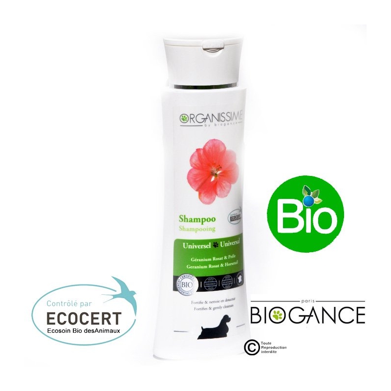 Biogance Bio universel shampoing pour chien : ligne cosmétique écologique et biologique certifié Ecocert. Shampoing bio chien nettoie en douceur et fortifie le pelage de votre chien grâce aux huiles essentielles avec des actifs naturel.