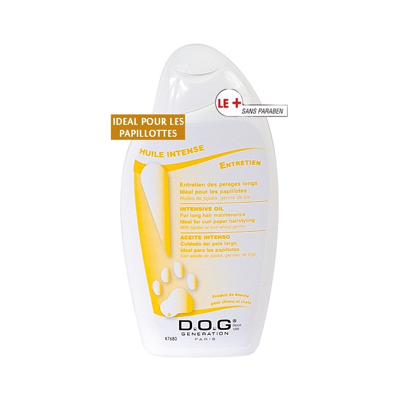 HUILE INTENSE c'est un mélange subtil , idéal pour l'entretien des fourrures longues et sèches . Assurant une meilleure pousse du poil , l'association des huiles de germe de blé et de jojoba va gainer et assouplir le poil . Hydratant et nourrissant , convient particulièrement à la technique des papillotes .
