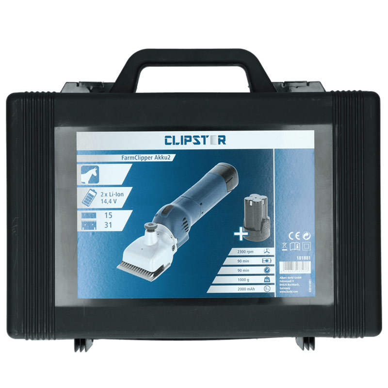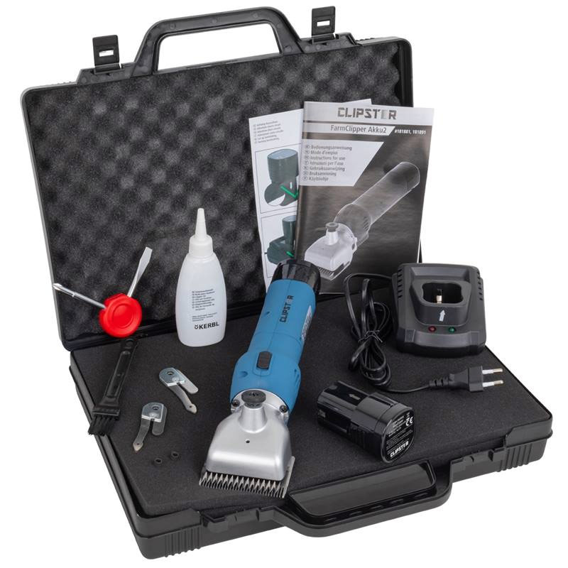 Tondeuse pour gros chien et chevaux FarmClipper nouveau modelé batterie Li-lon 14.4 Volts d'autonomie 90 minutes la FarmClipper Accu livrée avec lames premium et 1 accu de rechange Excellente prise en main avec un faible Poids env. 1,2 kg (batterie comprise et lames). Offre exceptionnelle La tondeuse est livrée dans un solide coffret avec lame 21/23 dents, 2 batteries.