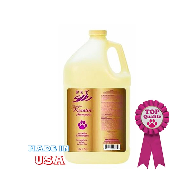Shampooing Pet Silk Brazilian Keratin. Shampooing régénère et protège, la protéine kératine naturelle qui régénère le poil redonne vitalité et brillance. il très économique diluable à 16: 1 est utilisé pour les chiens et les chats.