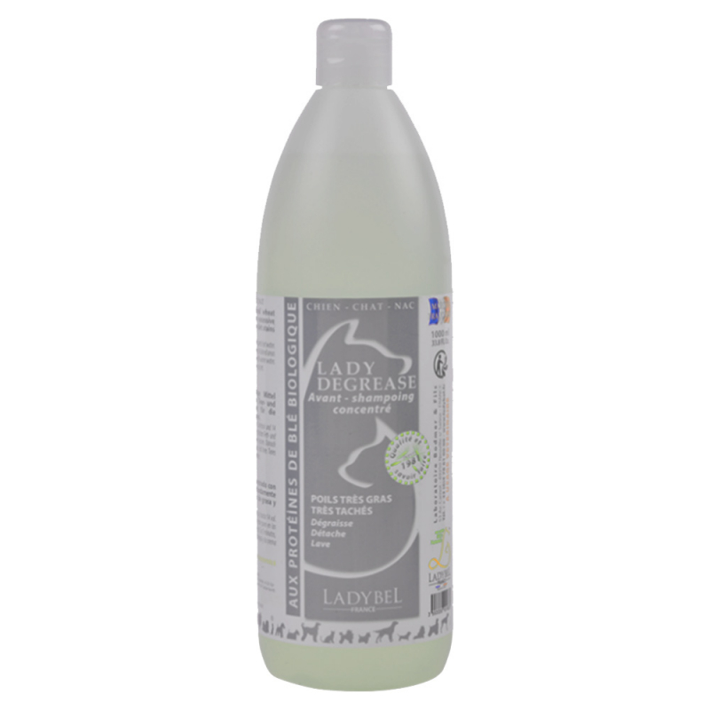 Ladybel shampoing LADY DEGREASE Avant shampoing concentré aux protéines végétales de blé, il dégraisse en profondeur les sécrétions de séborrhée ou les taches de graisse, goudron et cambouis. A utiliser pur ou dilué, 1 volume d'après-shampoing et jusqu'à 14 volumes d'eau chaude soit 2 litres. L'ensemble de notre gamme shampoing Ladybel est disponible ICI