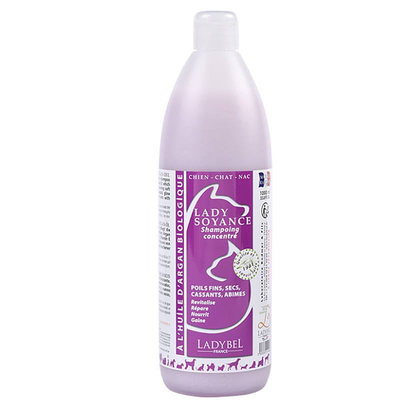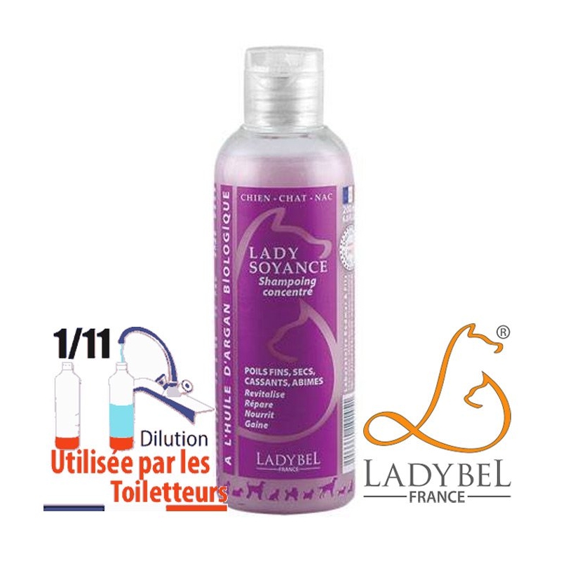 Shampoing pour chien Lady Soyance shampoing hydratant a huile Argan Omégas 6 & 9, vitamine E et anti-oxydant ultra nourrissant qui revitalise et restaure les fourrures sèches. A utiliser pur ou dilué, 1 volume d'après-shampoing et jusqu'à 14 volumes d'eau chaude soit 3 litres. L'ensemble de notre gamme shampoing Ladybel est disponible ICI