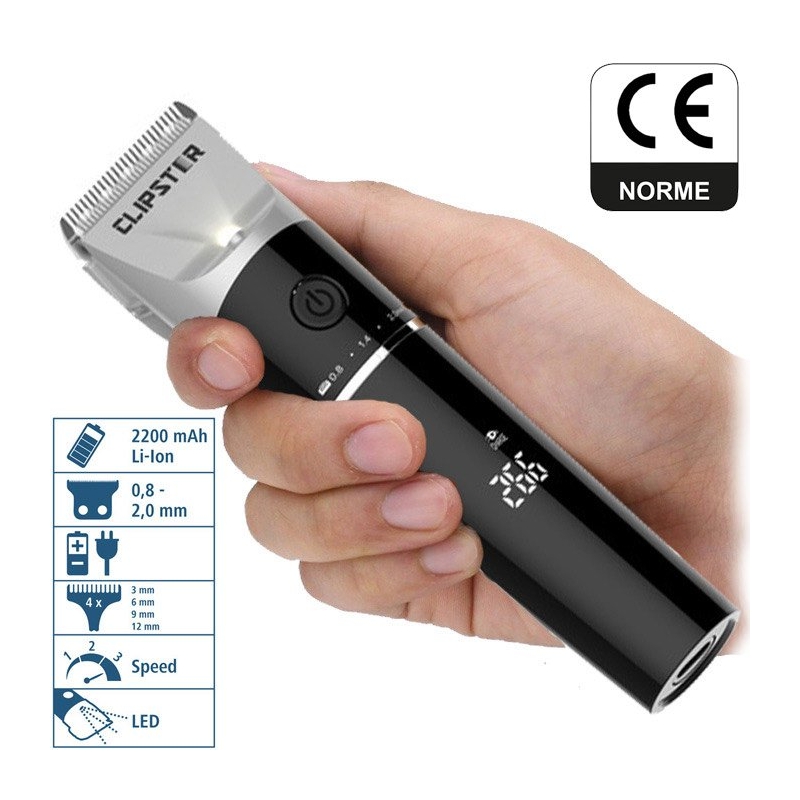 Kerbl Clipster DeloX tondeuse sans fil pour chien et chat 3 vitesses avec batterie Li-on 2200mAH affichage Led, Hauteur de coupe de 0.8 a 2mm cette tondeuse est livré avec un chargeur et 4 sabots. L'ensemble de notre gamme tondeuse de finition est disponible ICI