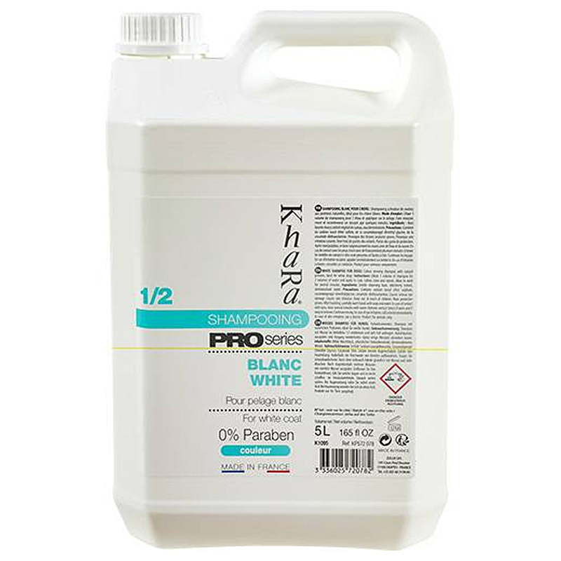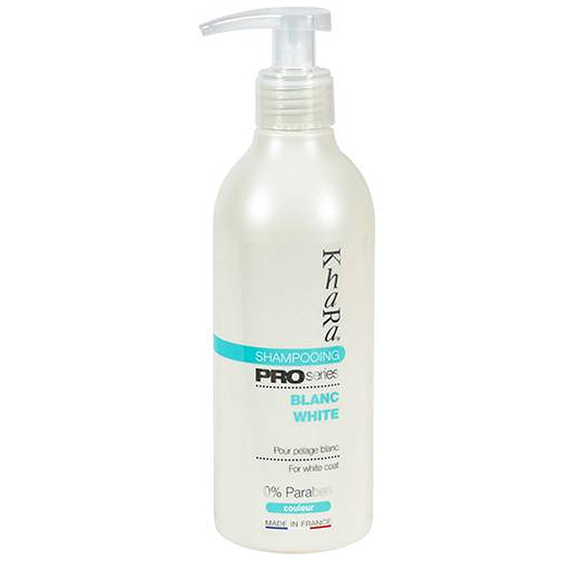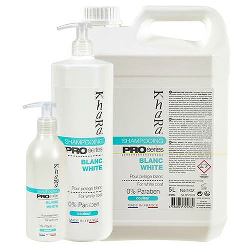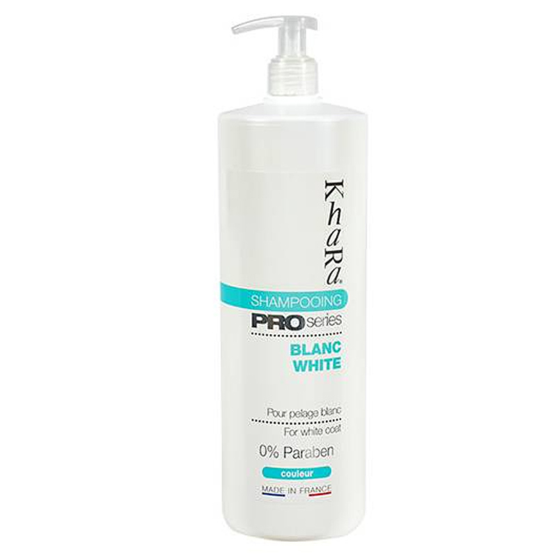 Shampoing pour chien blanc KHARA. Ce shampoing professionnel permet déjaunir le poil blanc, son pH respecte l'épiderme et limite risques d'allergie. Les produits Khara peuvent être facilement utilisés par les particuliers qui souhaitent le meilleur pour leur chien.