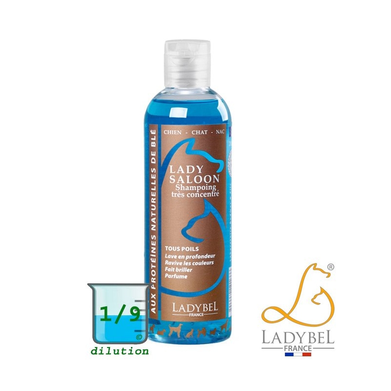 Lady Saloon shampoing pour chien & chat universel. A utiliser pur ou dilué, 1 volume shampoing et jusqu'à 9 volumes d'eau chaude soit 2 litres. Pour tous types de poils et idéal pour lavages fréquents aux protéines biologique de blé.