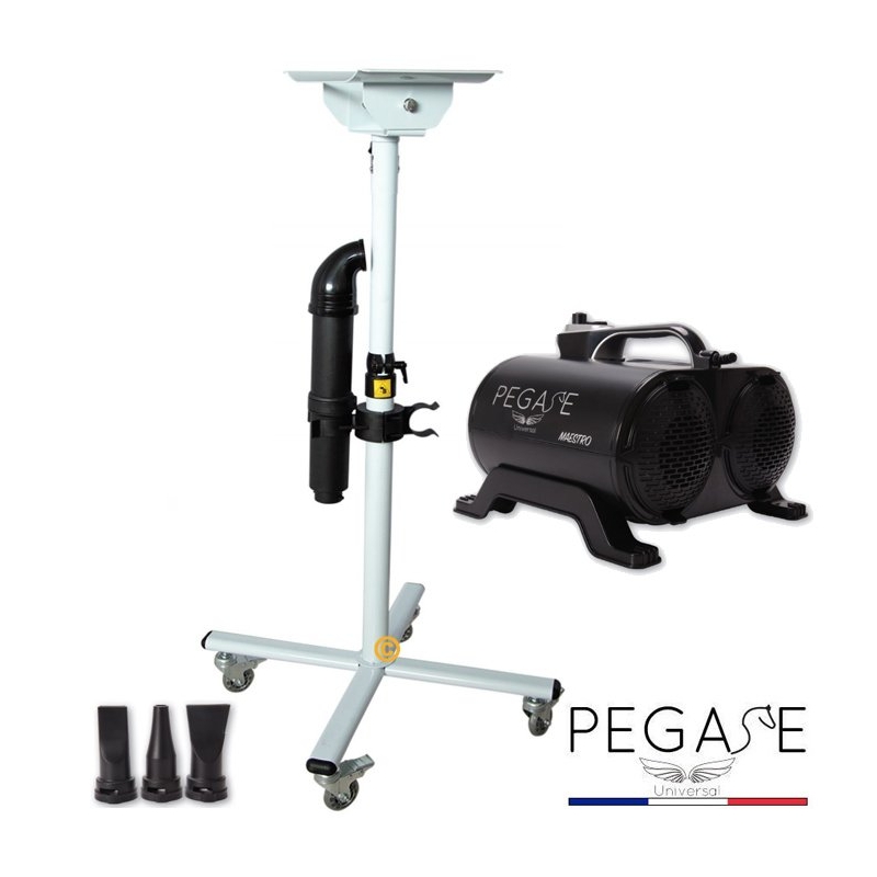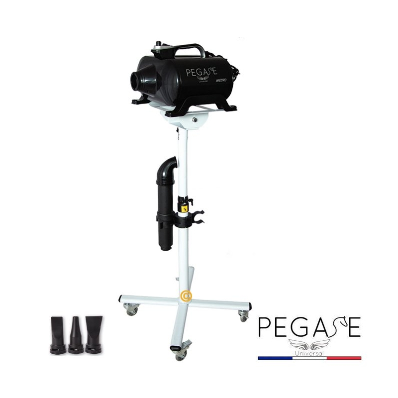 Pied et tuyau pour séchoir-pulseur Maestro Pegase Universal. Ce pied sur roulettes vous permet de transformer votre séchoir-pulseur Pegase Universal Maestro portable en appareil sur pied