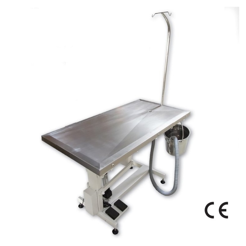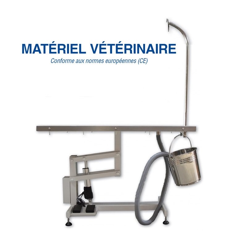 Table d'opération vétérinaire avec vérin électrique actionné par commande à pied : le plateau rectangulaire fixe mesure 60x120cm, il est en inox avec tuyau de vidange, seau à déchets, perche d'intraveineuse. Avantage importateur & SAV est en France. Table destinée aux particuliers ou professionnel de toilettage. A l'attention des utilisateurs : une fois attaché à la potence le chien ne doit pas rester sur la table sans surveillance