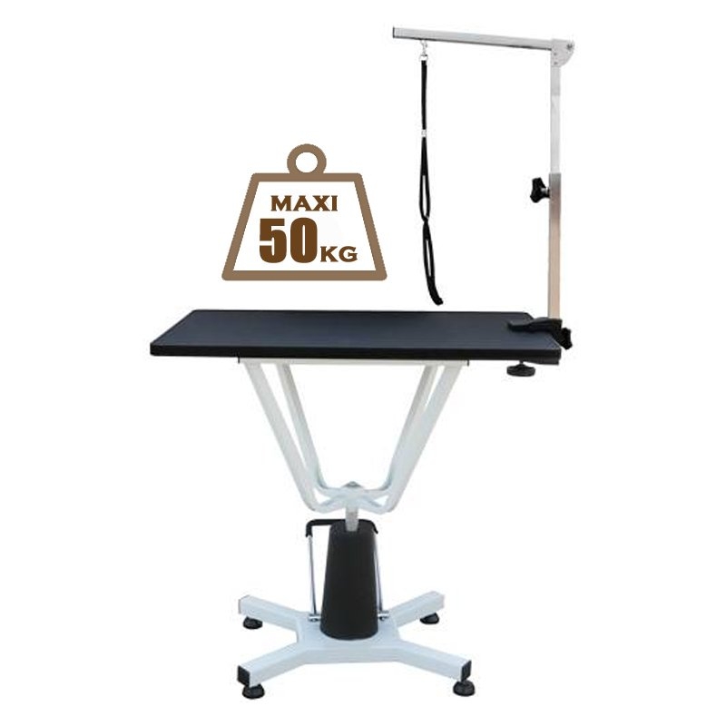 Cette table toilettage convient particulièrement à des chiens calmes et de petite ou moyenne taille et chat a commande hydraulique avec Plateau tournant de forme rectangulaire et potence. d'autres tables disponibles pour particulier au professionnel de toilettage.