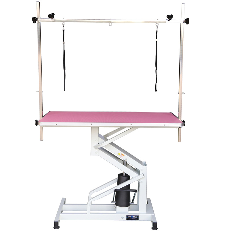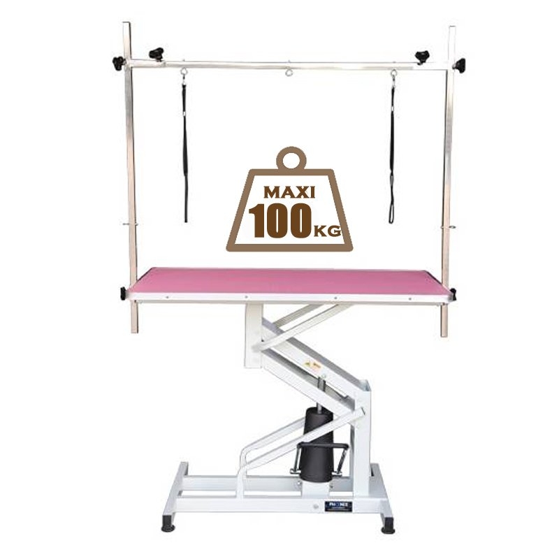 Table de toilettage à vérin hydraulique à plateau fixe Venus Meca chiens de petites et moyennes tailles, plateau recouvert d'un tapis anti-dérapant rose livré avec potence. Table destinée aux particuliers ou professionnel de toilettage. A l'attention des utilisateurs : une fois attaché à la potence le chien ne doit pas rester sur la table sans surveillance
