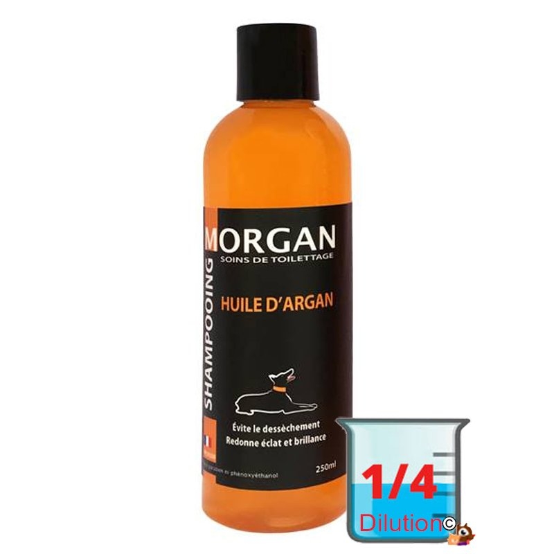 Shampoing à l'huile d'argan Morgan recommandé pour les chiens à fourrure longue et soyeuse donne un effet plombant très concentré diluable jusqu'à 4 fois il est régénérateur par excellence, évite le déssèchement de la fourrure et redonne éclat et brillance à la fourrure.
