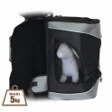 Sac à dos semi-rigide en tissu gris et noir, idéal pour les balades avec votre petit chien avec une grande ouverture avec fermeture éclair sur le dessus.