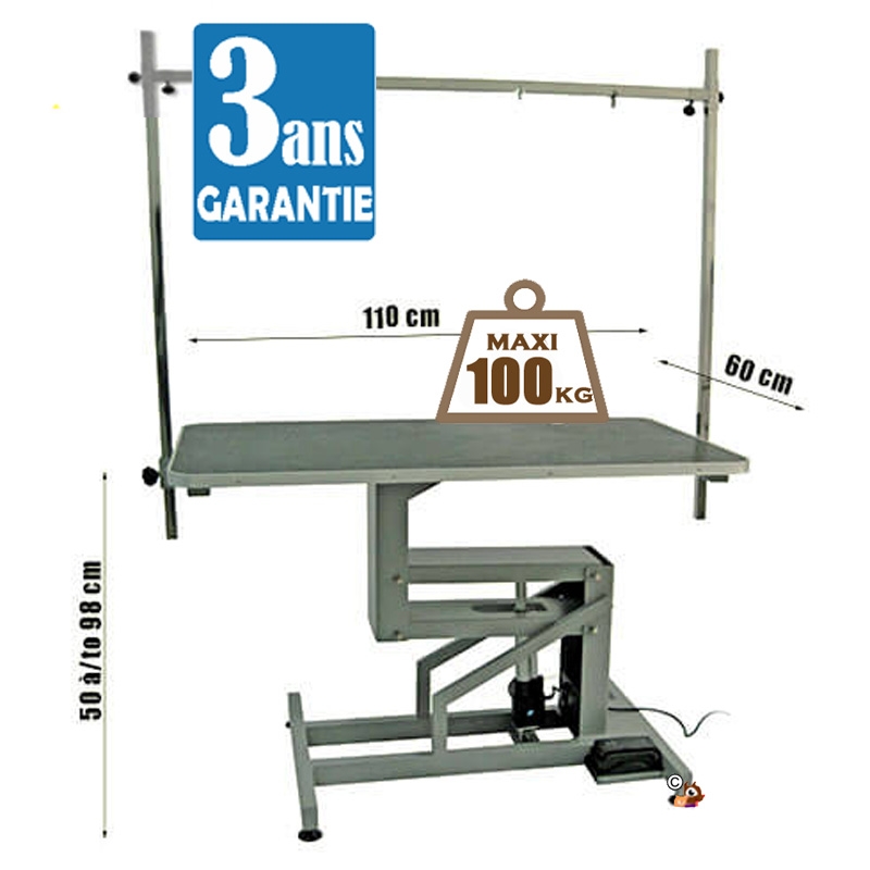 Cette table de toilettage électrique TE1100 est spécialement conçue pour les moyens et grand chiens. Elle à une variation de la hauteur de 50cm à 98 cm grâce à sa commande au pied. d'autres tables disponibles pour particulier au professionnel de toilettage.