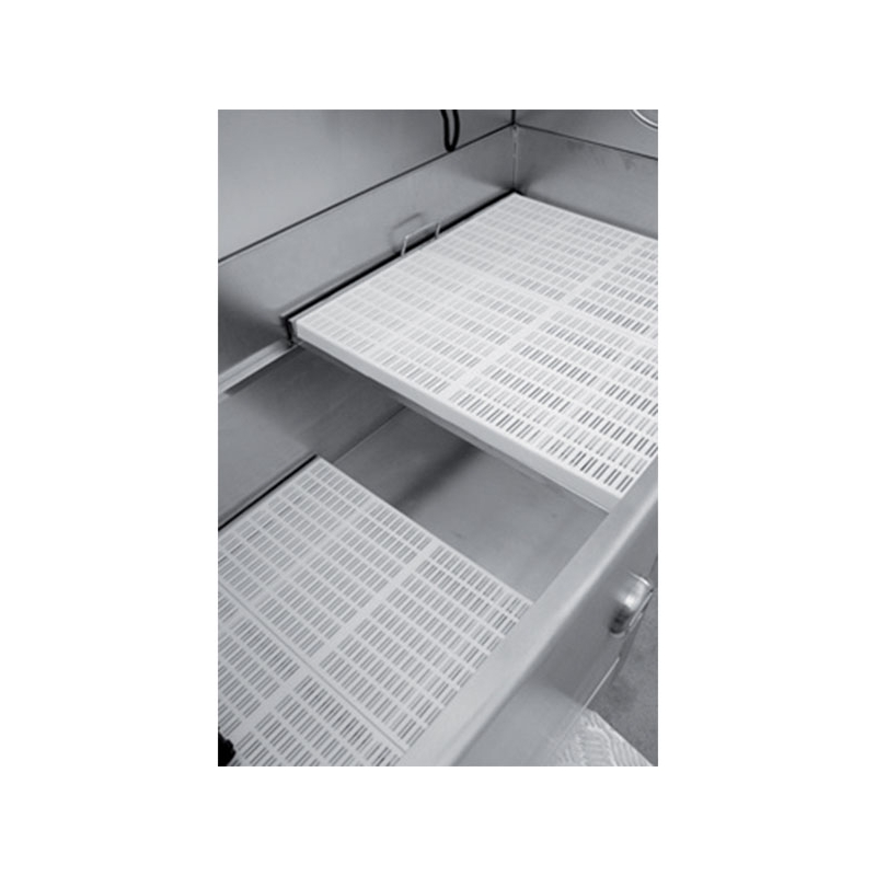 Réglable en hauteur du bac avec un vérin électrique puissant avec son système de commande au pied monté sur un Châssis gris renforcé avec traitement anti-corrosion.