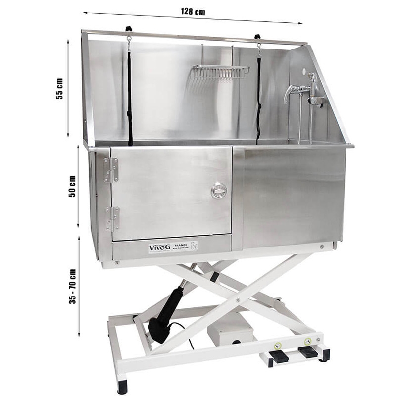 Baignoire chien Inox sur châssis électrique pour le réglable a hauteur du bac avec son système de commande au pied. Spécial petits à grands chiens.Voir l'ensemble de notre gamme baignoires disponible