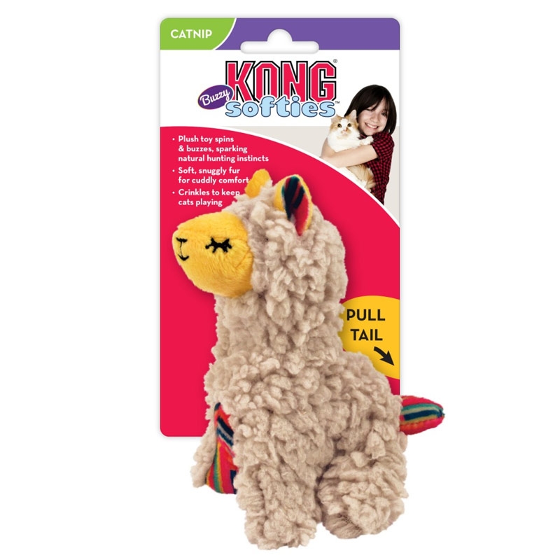 Offrir à votre chat cette peluche Kong vibrante Lama Softies Buzzy, une cache sous sa fourrure est garnie d'herbe à chat Premium