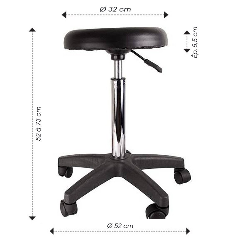 Tabouret avec pompe à gaz réglable en hauteur de 52 à 73 cm environ - pied étoile à 5 roulettes avec siège de 32 cm de diamètre, épaisseur 6,5 cm, adapté au travail en salon de toilettage