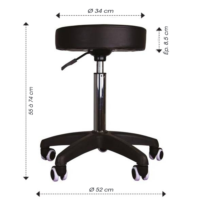 Tabouret réglable en hauteur de 52 à 74 cm environ par pompe à gaz - pied étoile à 5 roulettes avec siège de 34 cm de diamètre, épaisseur 8,5 cm, - adapté au travail en salon de toilettage0