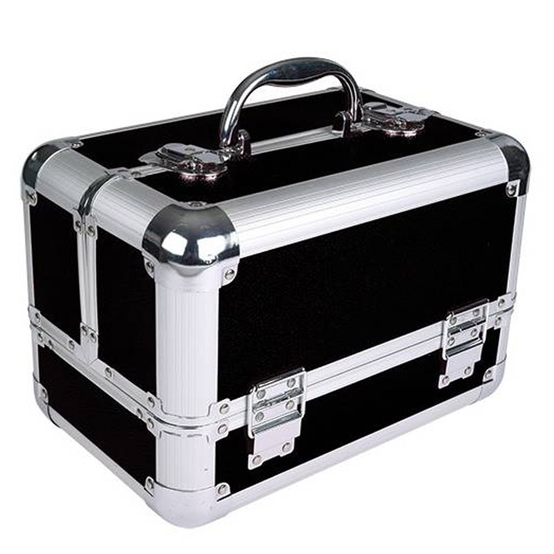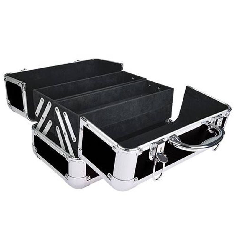 Mallette pour le rangement d'accessoires de toilettage aux coins renforcés et garnitures en aluminium avec 1 compartiment inférieur et 4 tiroirs en accordéon.