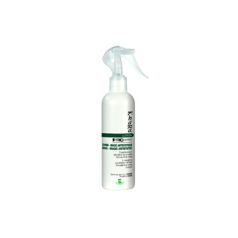 Khara magic lotion Cette lotion est un super conditionneur démêlant sans huile et antistatique aux extraits d'Aleo Vera. Son action pendant le brossage quotidien empêche la formation de nœuds, empêche le feutrage et combat l'électricité statique. Convient à tous les chiens à poils longs ou mi-longs et destinés à être exposés.