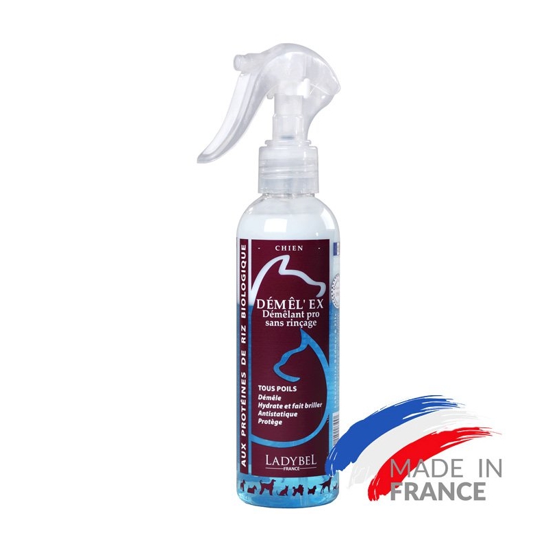 Démêlant pour chien professionnel Spray Demelex LadyBel surpuissant composé d'une association de silicones et de protéines de blé, permettant de démêler les noeuds et faciliter le brossage tout en déposant sur les poils un film protecteur nourrissant et brillant il est restructurant et antistatique.