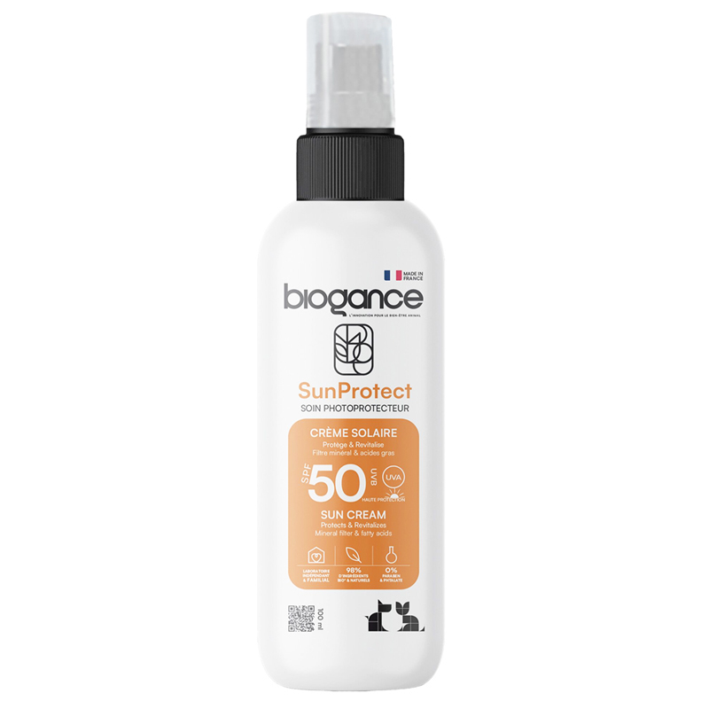 Le Sun Protect Biogance est un spray solaire naturel conçu pour protéger la peau et le pelage des chiens et des chats contre les effets nocifs du soleil. Sa formule douce aide à hydrater, protéger et préserver la peau des animaux sensibles aux UV.
